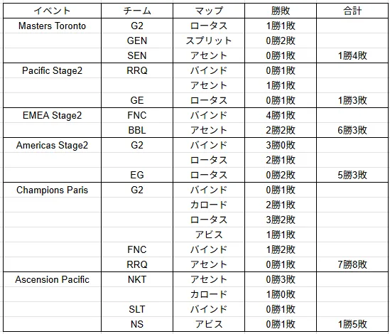 調査対象は、VCT Pacific、EMEA、Americas、ChinaおよびAscension Pacificです。テホがピックされたマップ、ピックしたチーム、その勝敗を集計しました。