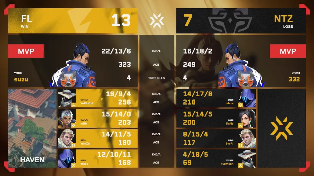その後も苦しい状況が続き前半ラウンドを2-10で折り返しました。後半ラウンドのFLは1stラウンドを取るも2ndラウンドではNTZのクラシックが火を噴きスリフティー。FLはなんとか追い上げようとしましたが、最終的に6-13でアビスを落とし、マップカウント1-2で敗北しました。