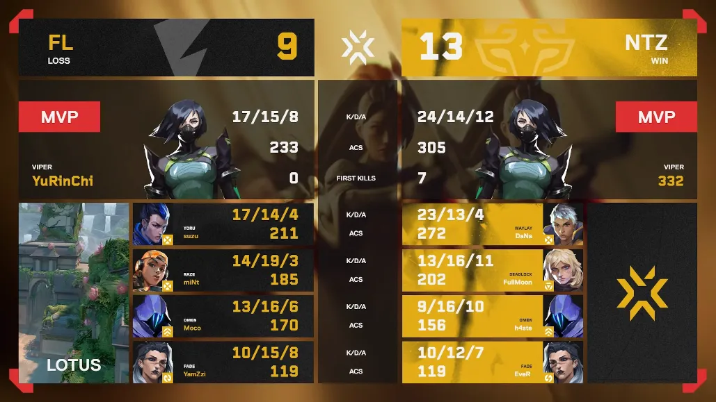 NTZがピックし、FLがアタッカー側でスタートしたロータスは、FLが好調なスタートを切って6-0まで差が開きました。しかし、そこからNTZの322(サムサムイー)選手とDaNa選手の強気なプレーにより巻き返され、前半は7-5で折り返しました。後半ラウンドではmiNt選手のスーパープレーが飛び出しましたがもNTZの勢いは止まらず、9-13でロータスを落としました。