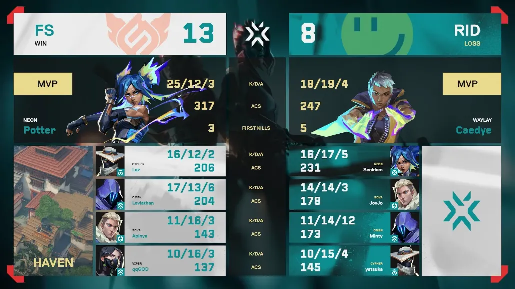 そこからRIDは8-9まで追い上げましたが、FSも勢いを取り戻して3ラウンド連取。勢いに押されRIDは10-13でアビスを落としました。この結果を受けてマップカウント0-2でRIDは敗北しました。