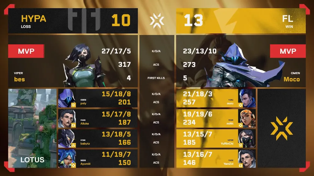 FLがピックしディフェンダー側で開始したロータスでは、前半ラウンドはHYPAの勢いに押されながらも、なんとか6-6で折り返しました。後半ラウンドはシーソーゲームとなり、緊張感のあるラウンドが続きましたが、9-10で迎えた第20ラウンドでは苦しい状況をMoco選手がクラッチ。その後もMoco選手の堅実な立ち回りで流れを相手に渡さず、FLが13-10で勝利しました。