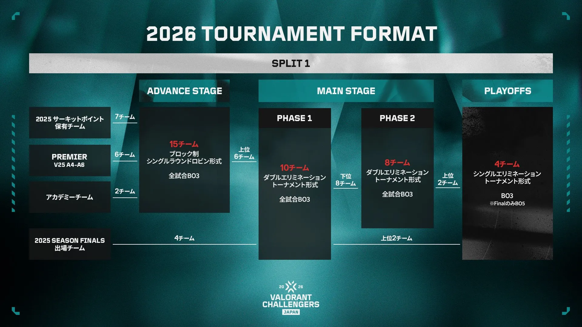 VALORANT Game Changers Japan 2026は2025年シーズンと同様に2 Split制で行われます。
