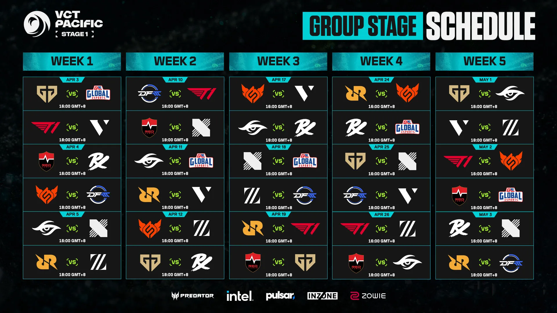 2026年3月17日、VCT PacificのX公式アカウントよりStage 1のスケジュールが発表されました。6チームずつが2つのグループに分かれての総当たり戦となっており、5週間にわたって全チームが1週間に1試合行う予定です。