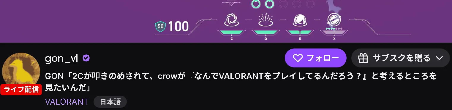 さらに告知した当日には、先日話題となったnAts選手がBoaster選手に向けて行ったトラッシュトークをもじり“GON「2cが叩きのめされて、crowが『なんでVALORANTをプレイしてるんだろう?』と考えるところを見たいんだ」”というタイトルでGON選手は配信を行っていました。
