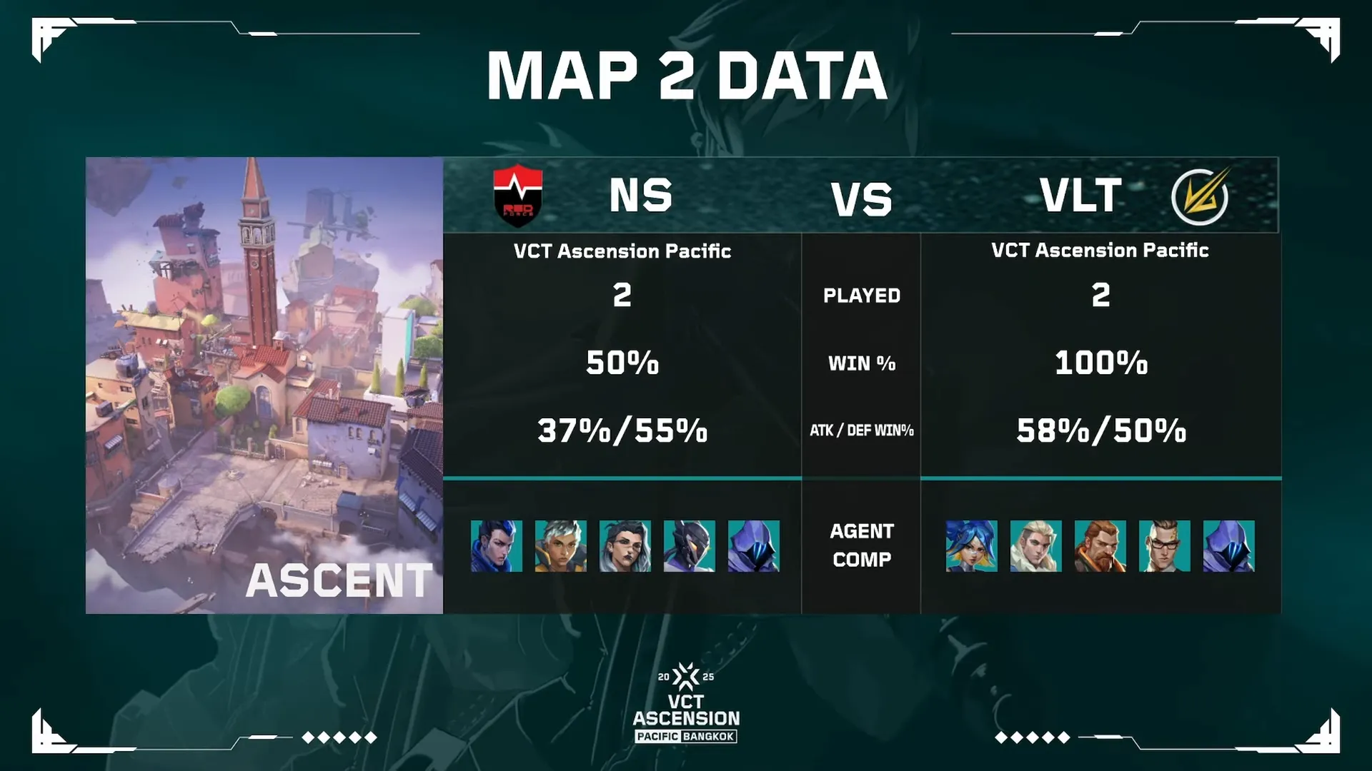 ここからは、Velocity Gamingの戦略について触れていきます。まず、彼らのプレイスタイルで最も特徴的なのは、ほとんどのマップで「ブリーチ+ネオン」の構成を採用していることです。特にアセントではメタから大きく外れた構成ながらも、高い勝率を誇っています。