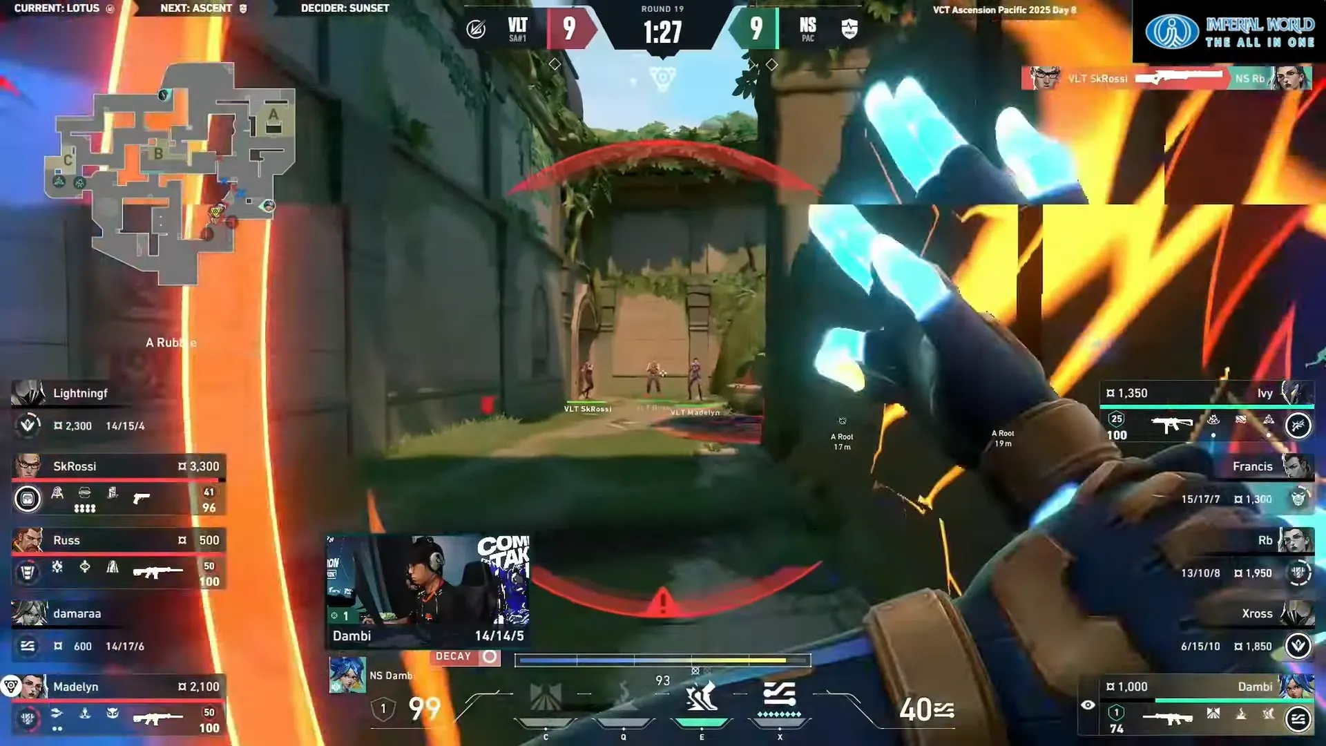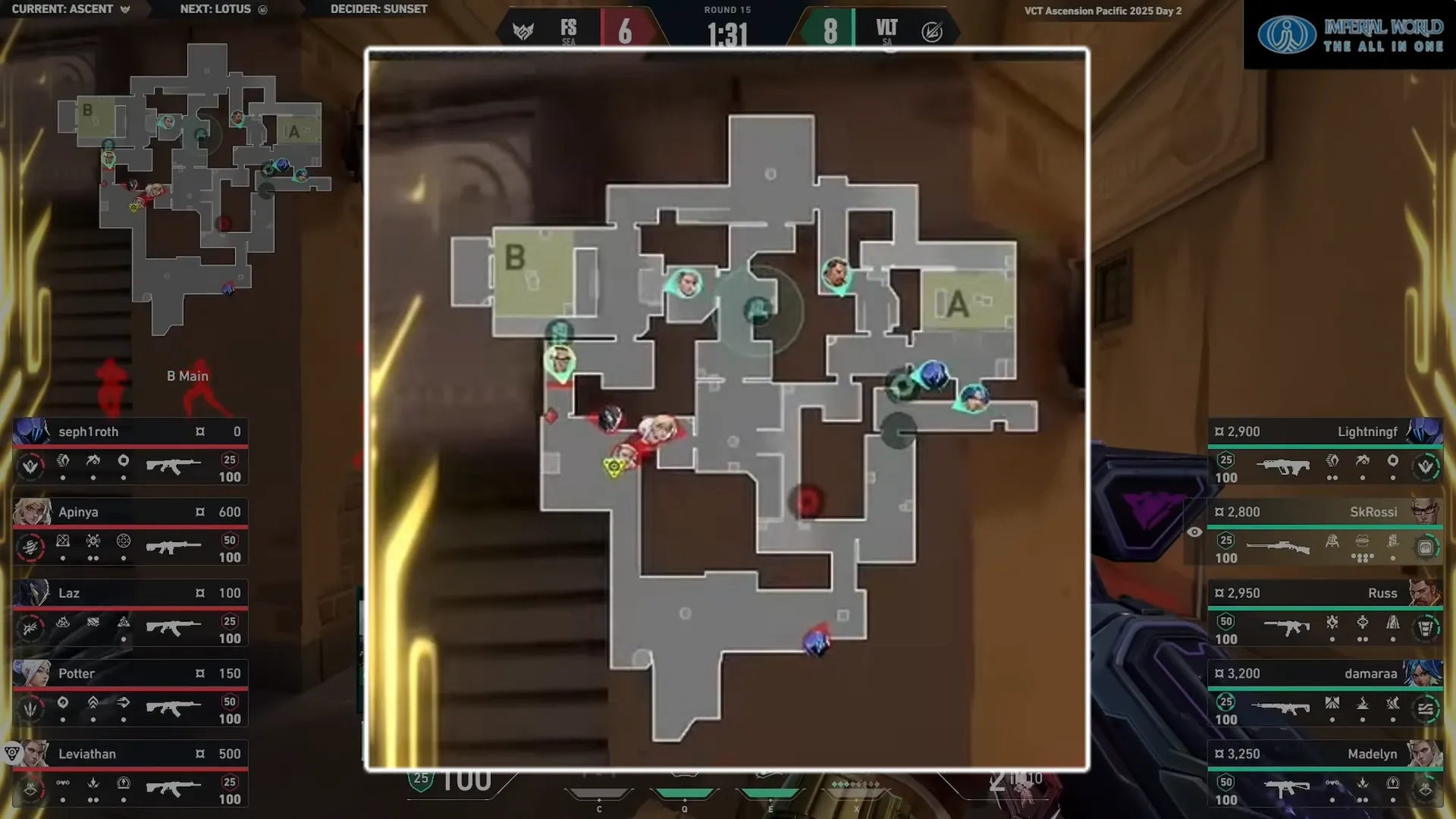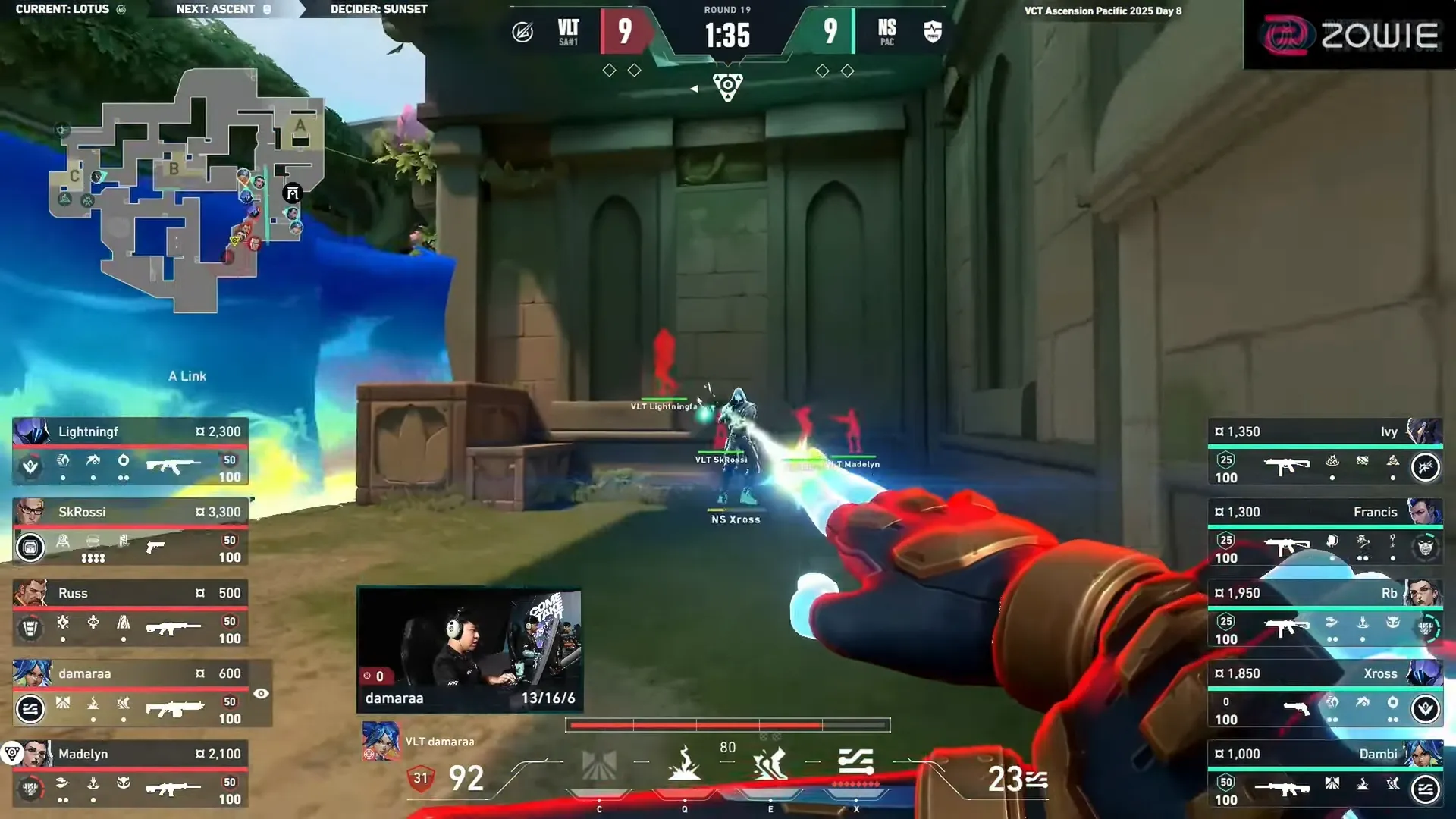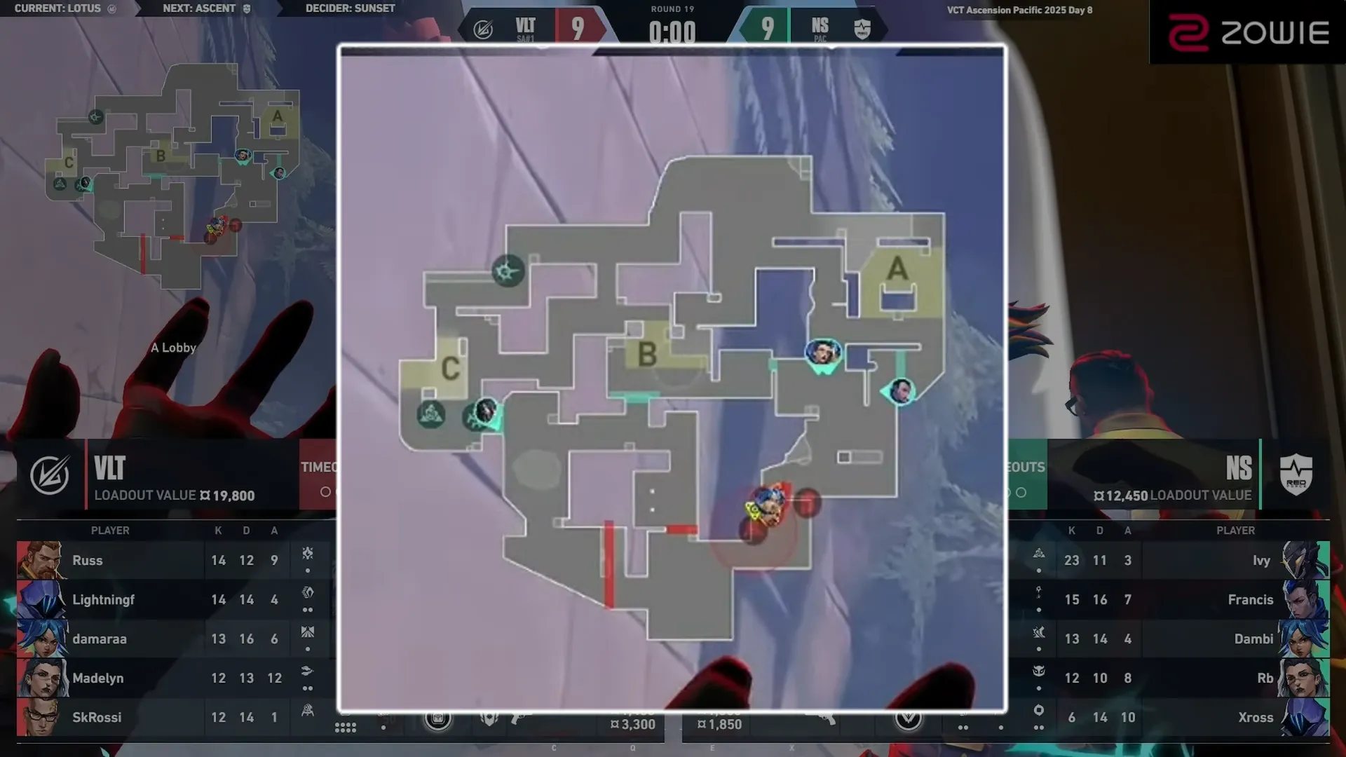 ここで、その強さが表れているラウンドを一つ見てみましょう。Nongshim RedForce戦の第一マップ、ロータスでの、Velocity Gamingによる攻撃です。