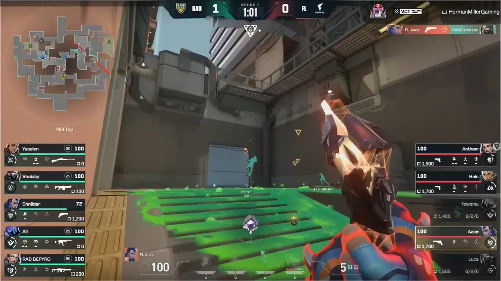 前半ラウンドでは開幕からエジプト代表のRADが4連続取得。0-1で迎えた第2ラウンドではエコラウンドを強いられたFLでしたが、その中でもシェリフを持ったAace選手が相手のジャンプピークをヘッドショットで撃ち落として、そのまま3キルするというスーパープレーが見られました。