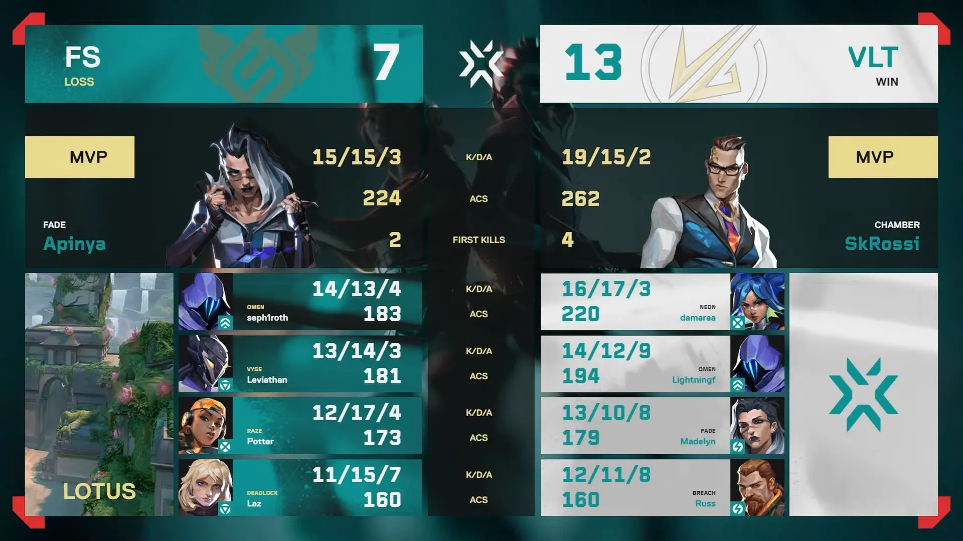 続くロータスでは、FULL SENSEは構成自体はアセントと似ていたものの、選手間で使用するエージェントの交代が行われています。Velocity Gamingはアセントと同様、ブリーチ+ネオンの強力なセットアップを主体とした構成を継続しました。