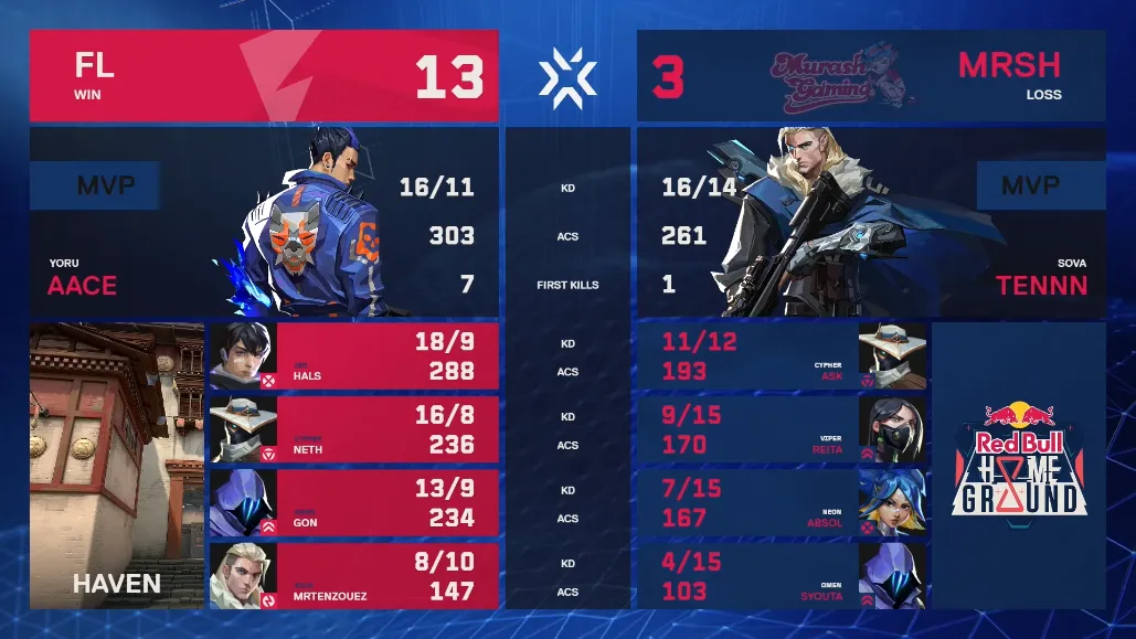 MRSHの希望を打ち砕き、圧倒的なパフォーマンスでFLが13-3でヘイブンを取り切りました。この結果を受けてFLが3-0でMRSHに勝利し、MVPは3マップ連続でFL Aace選手が取得しました。